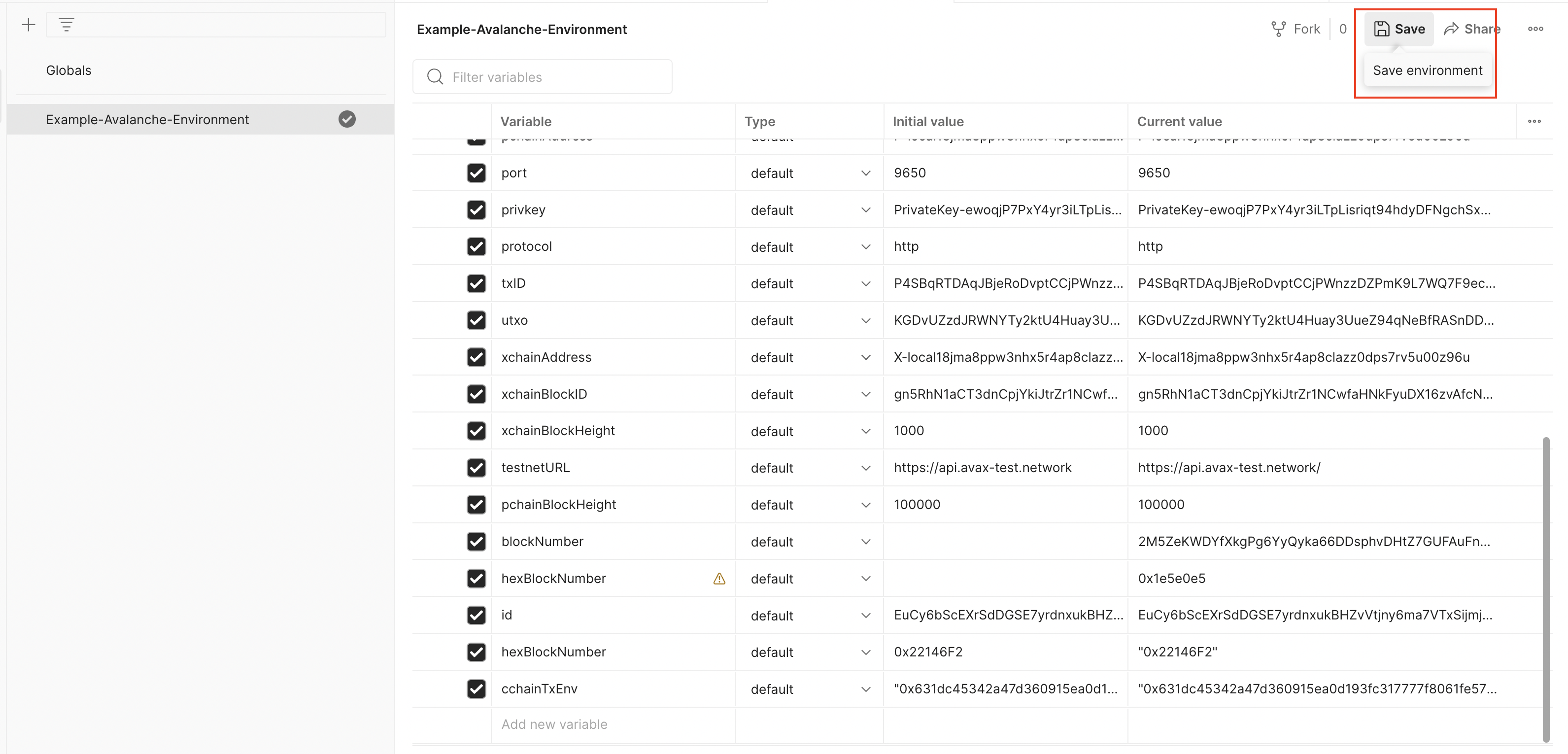 Only default variables are used in the Avalanche Environment file. To learn more about using the secret type of variables, please checkout the Postman documentation.